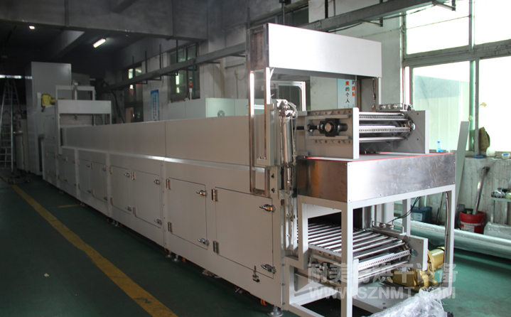 生产流程:1.治具到达上件工位→→→2.机械手取件放置→→→3.进烤炉升温阶段(速度温度均可调)→→→4.退火阶段(速度温度均可调)→→→5.下风冷却(2-5分钟可调)→→→6.治具到达下件工位→→→7.治具空走返回上件工位;